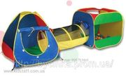 Игровая палатка для детей «Домики соединенные туннелем». Каждый домик имеет два сетчатых окна и двое дверей. У квадратного домика лаз имеется даже на крыше. В набор входят 100 мячиков диаметром 9см.